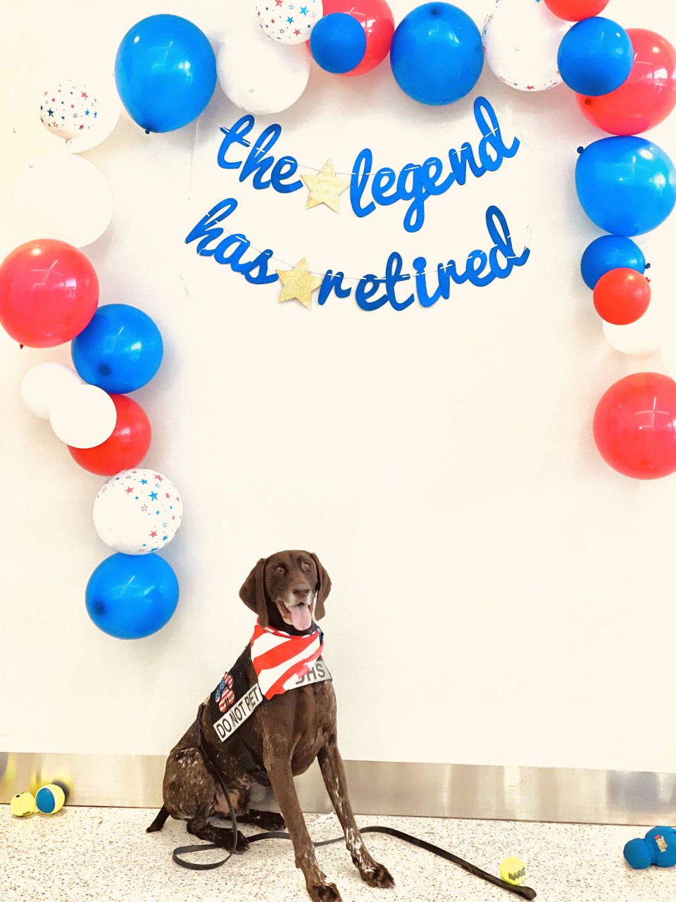 Alphie worked with the Marines in Afghanistan from 2012-2014. He then was deployed to Lackland AFB in San Antonio to be trained for Passenger Screening Explosive Detection for the TSA. I trained with him in 2014 and we continued to work with me until his retirement in 2019. We traveled to many cities in the US including Seattle, Denver, New York, Orlando, Nashville, Tampa, Chicago while being deployed from our home airport in Fort Myers, FL where we currently reside. He has spent his time after retiring eating and swimming and laying around! Well deserved! His favorite toys are tennis ball and kongs and his favorite food is cheese.