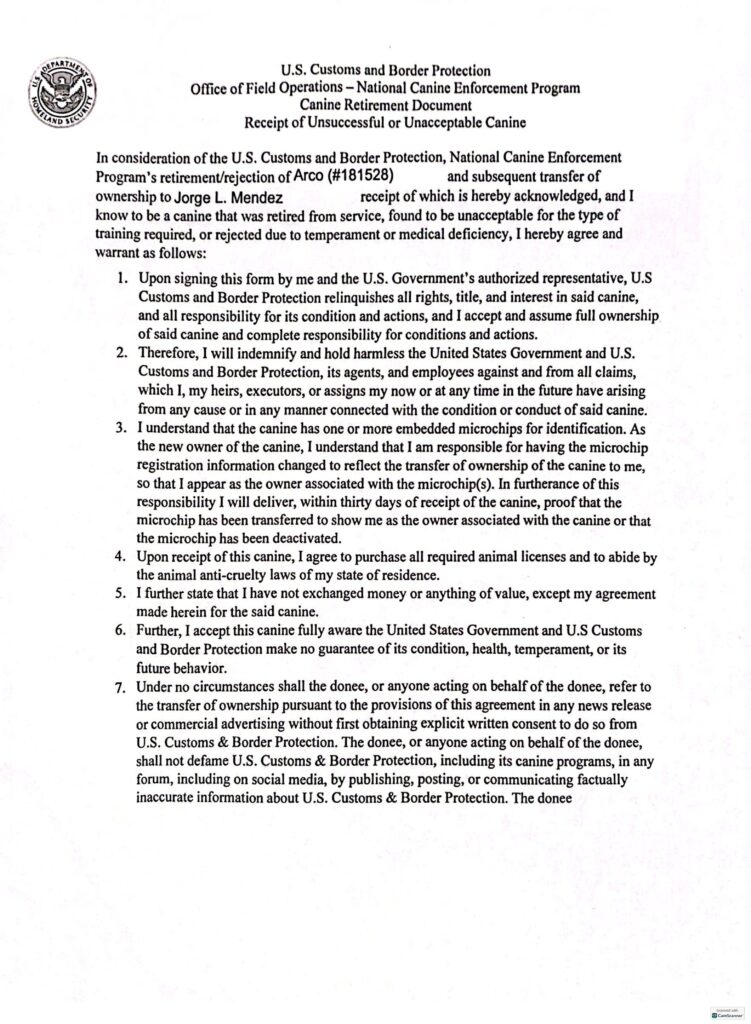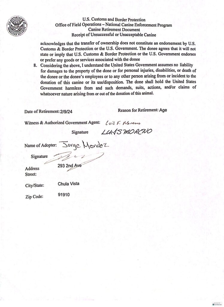 Arco was a narcotics and concealed human detection dog. Arco started his career at canine center El Paso and traveled to the San Diego field office where he worked for five years. He also worked at The otay and Tecate port of entries. He retired in February of 2024 and he is enjoying. Arco likes going on hikes and his favorite treats are carrot sticks.
