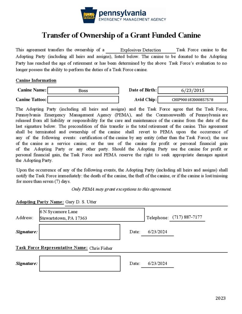 Capitol Police Explosives Detection K9 Boss is hanging up his leash and heading into retirement! A nine-year-old Belgian Malinois born on June 23rd, 2015, K9 Boss has been with the Pennsylvania Capitol Police for seven years. He and his handler Officer Gary Utter have performed thousands of explosives detection details, providing both visual and physical deterrents to anyone who may try to compromise the safety of the Capitol Complex and surrounding areas. Known for his laid-back temperament and above-average social skills, K9 Boss has been a fan favorite from the beginning, always drawing the attention of a passerby who couldn’t resist the urge to pet him. K9 Boss’ unique demeanor did not happen by chance. He was among the best of many K9s bred for service in Slovakia. During the selection process, Boss stood out for his physical fitness and showed strong signs of drive, loyalty, commitment, and courage. He further confirmed these traits when he completed the long hours of training for his certification to be an explosives detection K9 for the Capitol Police. And now, on his ninth birthday – June 23, 2024, K9 Boss will officially retire into the care of his friend and handler, Officer Utter, where he can just be a dog again, relaxing and thinking about treats.