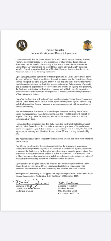 K9 Boyan is an 11 year old Belgium Malinois and German Shepherd mix. He served the US Secret Service for 8 years as an Explosive Detection K9. In that time he travelled to 27 different states and 3 countries Ireland, Germany and France protecting our nation’s leaders. Boyan was a very motivated worker! His favorite things to search were the large trucks at our remote delivery site. Boyan was an excellent traveler, content to be wherever his mom took him. He enjoyed relaxing in the hotel room and falling asleep while mom held his paw. He enjoyed searching in all the new places but especially visits to the beach. Now that Boyan is retired he stays strong with long walks and regular visits to Aquatic Paws to use the underwater treadmill. He is happy to have his Kong toy all the time. He is learning to share his house with his two brothers and new sister.