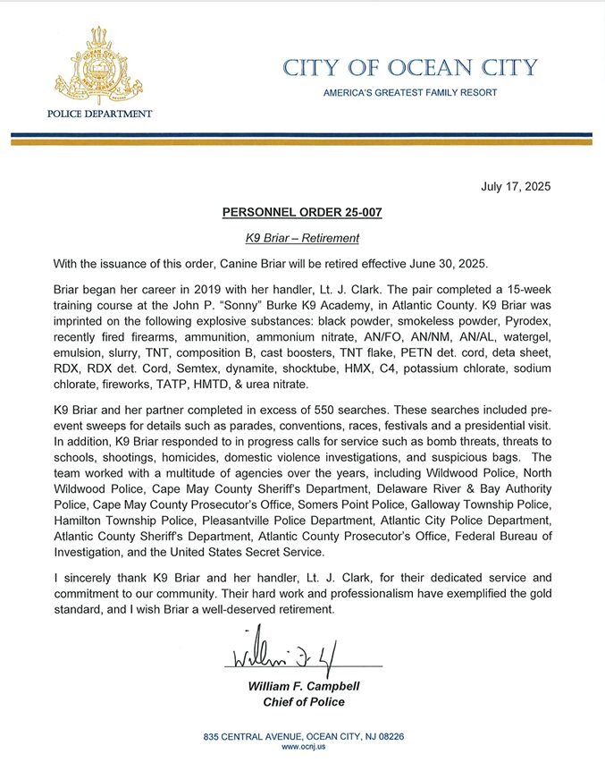 Briar was donated to the Atlantic County K9 Academy after being rescued from a shelter in South Jersey. We were partnered in the academy where were trained for 15 weeks. Briar graduated and was certified as an explosives detection canine. We were fortunate enough to work many special events over the years in Ocean City. We were also fortunate enough to work with local, county, state & federal agencies in New Jersey & New York. Briar is now happily retired, spending her time with my young children at home.