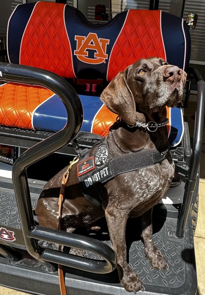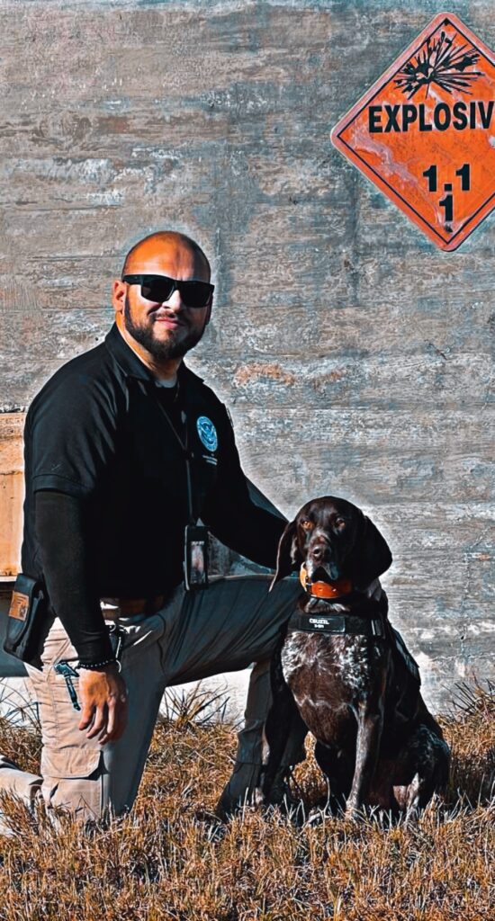 Csuzil is a high drive German Shorthairpointer that served the traveling public at Orlando International Airport (MCO) for over five years. Csuzil has participated in joint training exercises at Muncie, Indiana, Super Bowl 55 in Tampa, and Auburn, Alabama. Csuzil loves the pup cups from Starbucks and the free ice cream treats form Dairy Queen. On his down time he enjoys chasing squirrels in the backyard and playing with his Frenchie little sister and taking long naps.