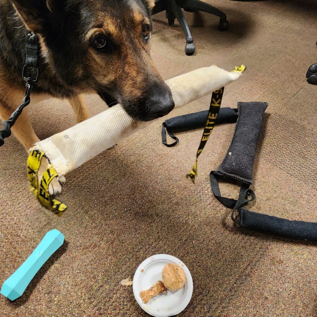 Diggs, is toy driven, he prefers any toy that you can paly tug of war with. After most finds he would get a puppy cone, which would only lst seconds. On his downtime he enjoys the cabin life and any chance he can hang outy in the water and forever chase whatever is thrown into the lake for him to chase.