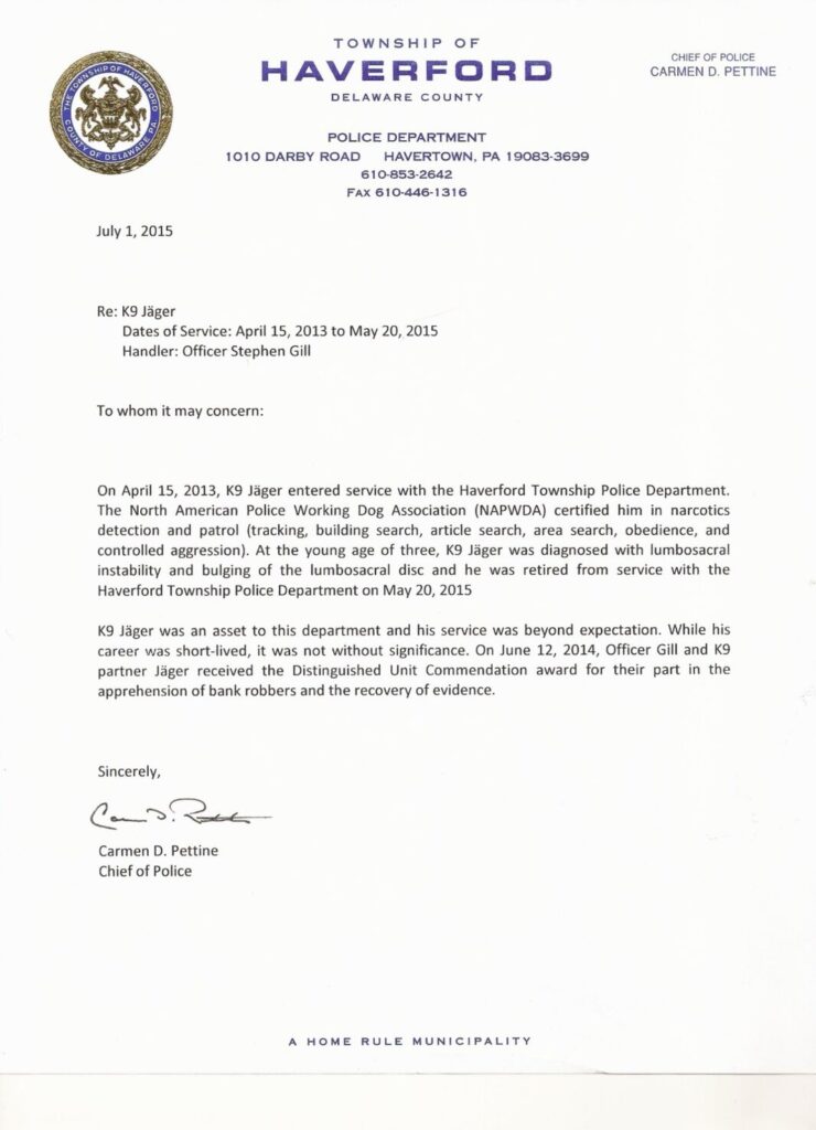 K9 Jäger served as a dual purpose, patrol and narcotics, dog for the Haverford Township Police Department, certified by NAPWDA. Jäger loved narcotics work and was involved in numerous narcotics investigations and arrests. Though his least favorite work was tracking, he was involved in tracking down and apprehending a bank robber that fled from police and was awarded two commendations for his role in the arrest. After serving only two years, Jäger was diagnosed with lumbosacral disease and spinal stenosis, which led to his retirement. Jäger’s outgoing and sociable personality had him loved by all members of his department and the public. After retirement, Jäger has been spoiled as a “puppy”, living his best life. Jäger loves to be outside, whether just lounging around, watching the neighbors or playing. Jäger loves to play un-build a bear with all of his new stuffed toys. Though Jäger is 12 years old now, his puppy personality always shows through.