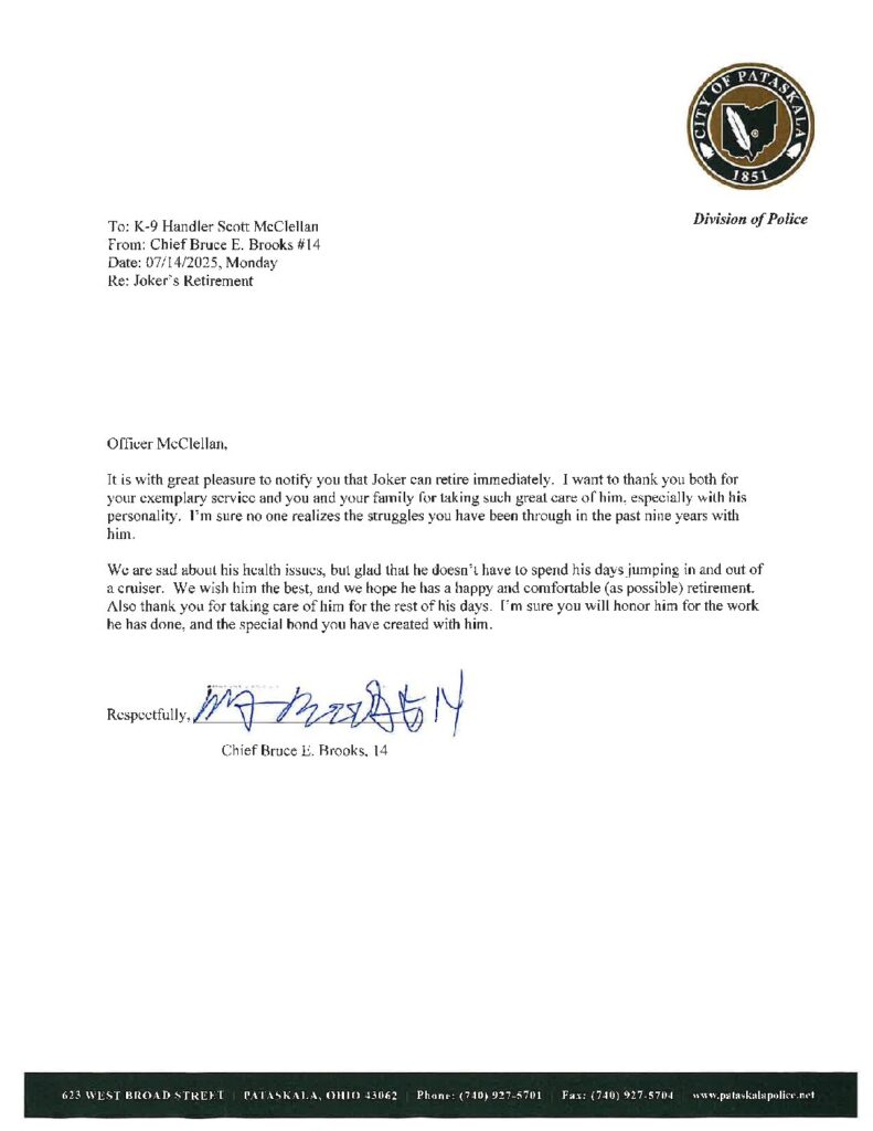 K-9 Joker went into service July of 2016. He was in service for 9 years. He was used by more than 19 agencies. He was used over 1000 times in his career.