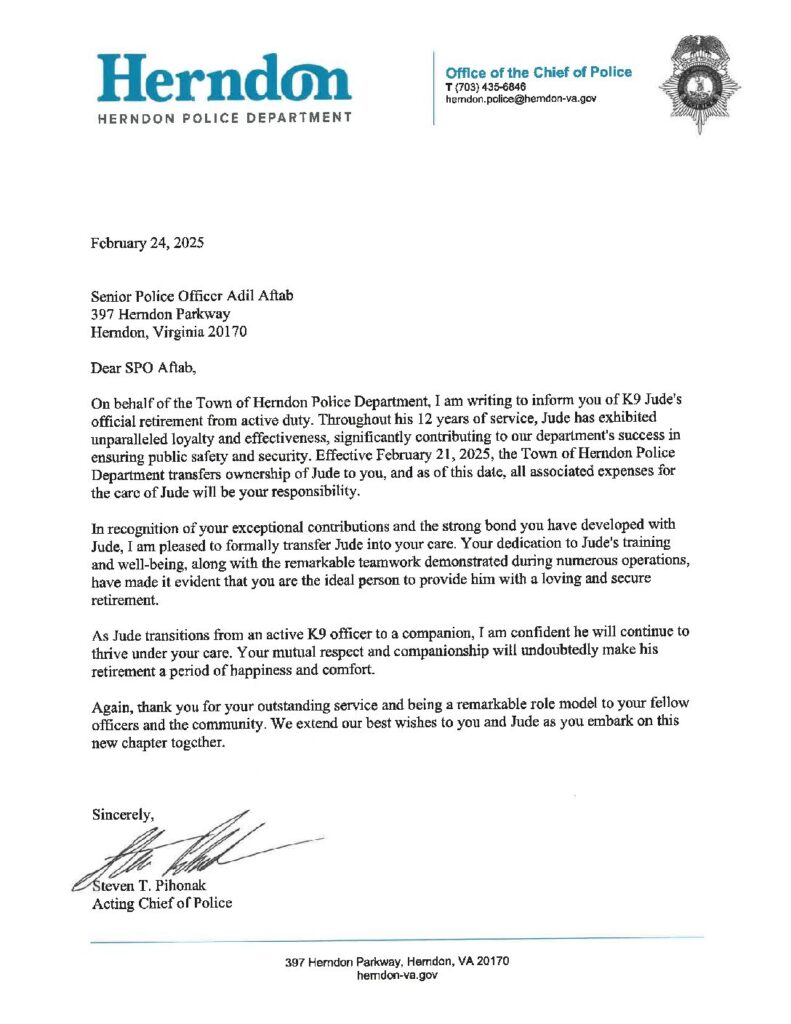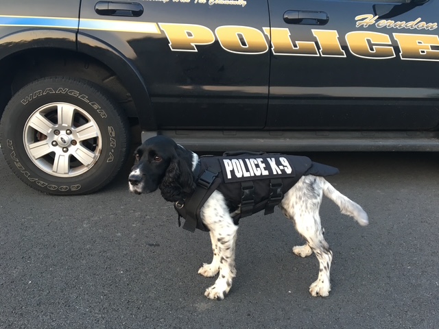 Jude has worked in Herndon during his career along side myself on patrol. Jude and I went through CIA K9 Training school and Certified with CIA, ATF and USPCA. Jude and I continued to train with CIA for approximately 10 years and he is trained to be food reward. Jude has been used to search unattended packages, building searches such as school bomb threats, car searches for explosives and weapons and outdoor searches for bullet casings, explosives and weapons. He was able to locate a hand gun during a search thrown by a suspect in to heavy brush along side W&OD Trail in Herndon. He has done sweeps and searches for surrounding counties. Including Herndon Festival, Fairfax Fair, Loudoun fair. Jude and I have attended numerous community events and career days due to him being very friendly with children. He has traveled to Raleigh, NC to compete in USPCA National Detector Field Trials. He placed first on package searches and fourth place overall. Jude enjoys going boating and loves to swim in the Potomac river. Many times he has brough us back dead fish floating in the river. He likes to chase squirrels, birds and rabbits. He also enjoys going on hikes through the woods.