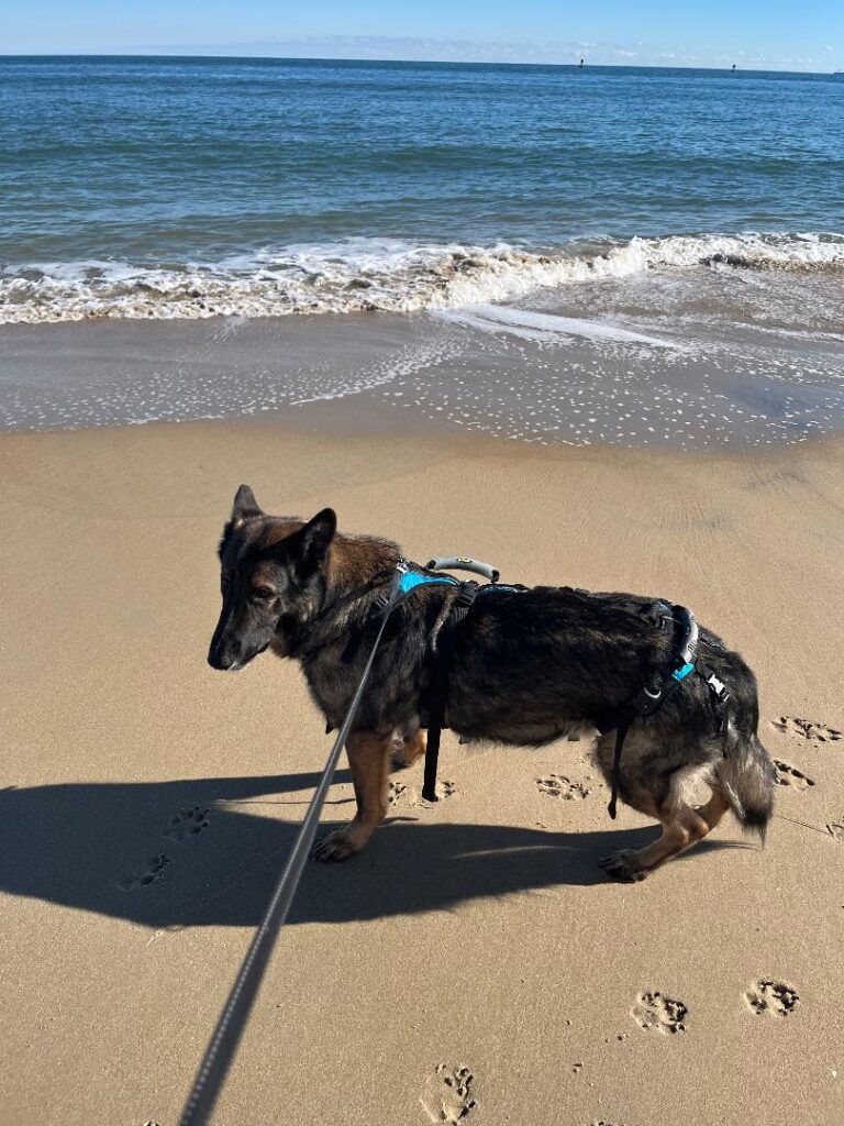 Lio is fun and loving, and loves to play like a puppy. Lio won’t go anywhere without his kong. The kong is his pacifier. While limited with his mobility, Lio still loves to play and enjoys the outdoors. I have found Lio in and around our neighbors chicken coop sniffing around and saying hi to all the chickens.