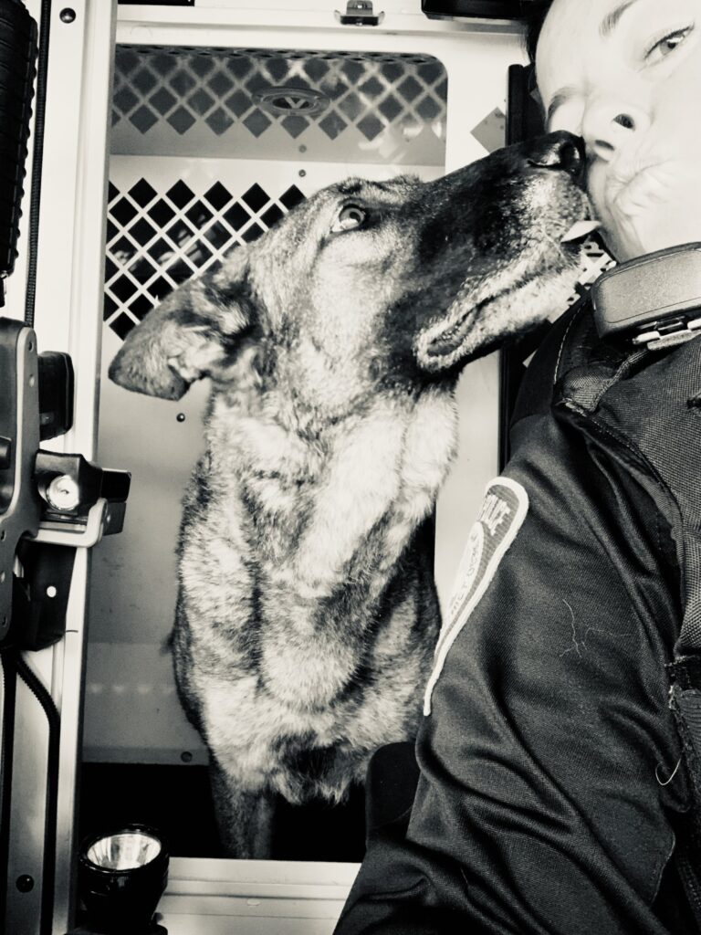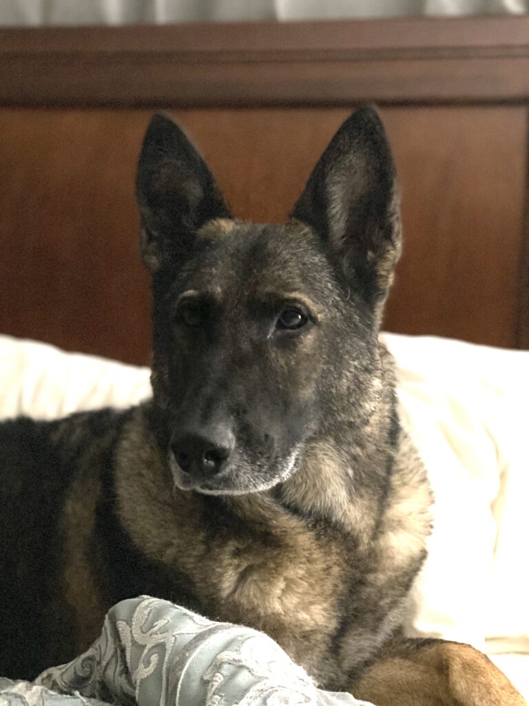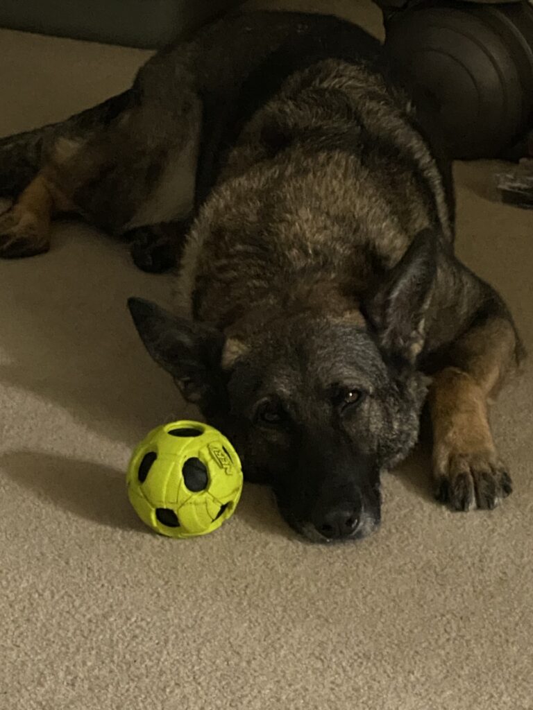 Mischa is an 11 year old German Shepherd. She had a successful 10 year K9 career at the San Diego Harbor Police providing detection services for the San Diego International Airport and the surrounding Tidelands, and Seaport. Some of her day to day working activities included airport sweeps, cruise ship sweeps, dignitary sweeps, random searches Including cargo, and public visibility sweeps. Mischa was a fast and efficient searcher with an amazing nose. She loved working and especially liked doing K9 demonstrations for the kids. Mischa was a quirky working dog and sometimes a borderline Drama Queen. Whenever a new working K9 came onto scene, she would have to meet them, give them the “lick” of approval prior to her being okay with them working around her. In other words, she needed to be acknowledged and noticed!! She has a very loving demeanor and loves all the boys (men and boy doggos)! She greets everyone with gusto!! Mischa loves being around people, likes to be petted, nose scratches, and kisses. If you don’t pet her immediately, she will sit and stare at you, and believe me, she can win any staring contest. This could be a testament to her stubborn streak. Mischa has embraced the retirement life. She loves being lazy. I find her all over the house sleeping with her ball next to her or in her mouth. She loves the couch, her hooman’s bed, the dog bed, and laying by the front and back door looking outside. She also loves hanging outside on the back porch watching for lizzards. One thing Mischa misses in retirement, is going to work with her Hooman. She misses riding in the car and always being around someone. So on her Hooman’s day off she loves going on car rides and hanging out at dog friendly restaurants/breweries/parks, and camping. Mischa loves when the grandbabies come to visit. She follows them around waiting for snackoos to drop on the ground.