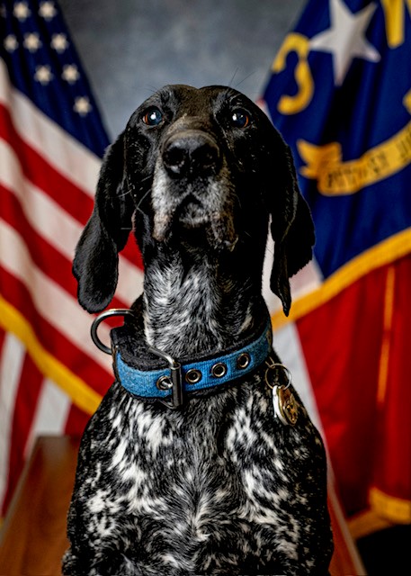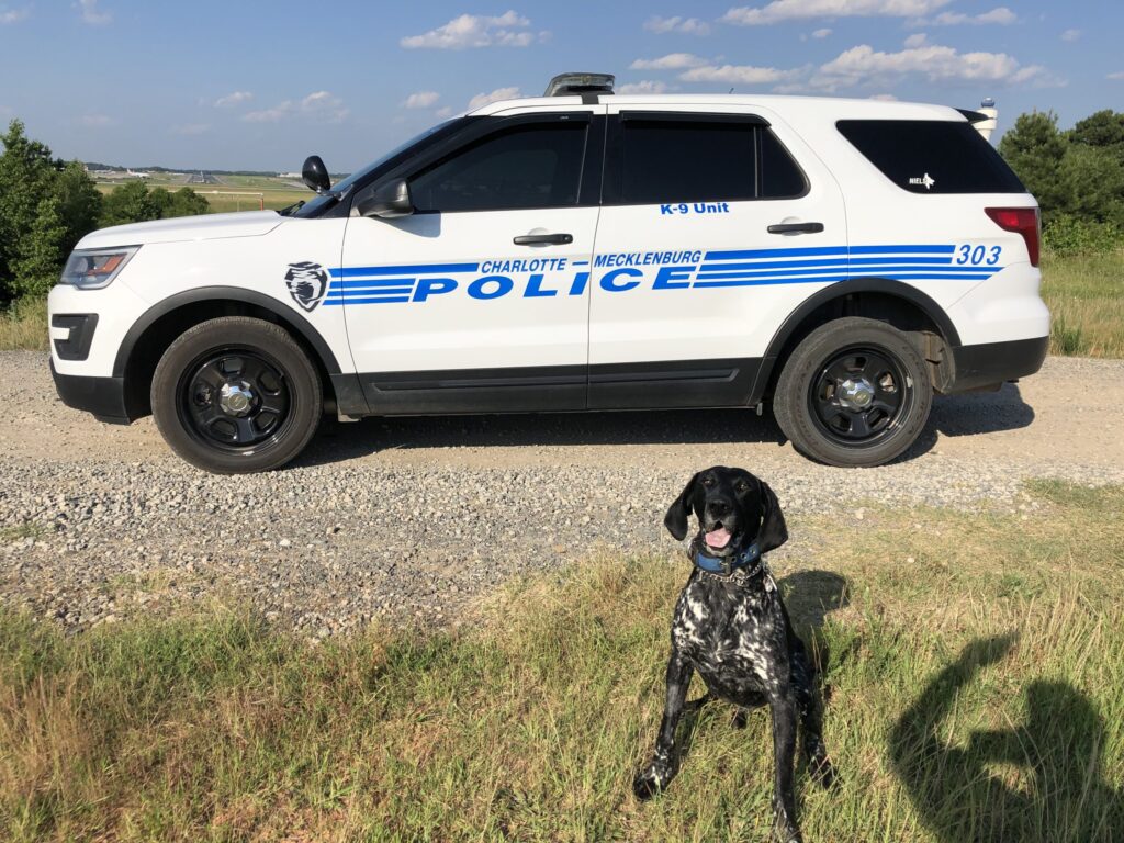 Niels is a 9 year old German Shorthaired Pointer that was a single-purpose Explosive Odor Detection Canine. He worked at Charlotte-Douglas International Airport for the TSA Canine Program with the Charlotte-Mecklenburg Police Department. Over the course of his career he worked his daily duties at the airport, as well as working many Carolina Panthers Football games, Charlotte FC matches, swept the backstage and stage areas at PNC Music Pavilion for concerts, ensured the safety of numerous high-profile visitors including Presidents, Vice Presidents, and many other politicians coming to Charlotte, NC. Now that Niels is retired he enjoys playing with his other four-legged brother and sisters, his tiny human, and curling up on the couch with any human that will give him love.