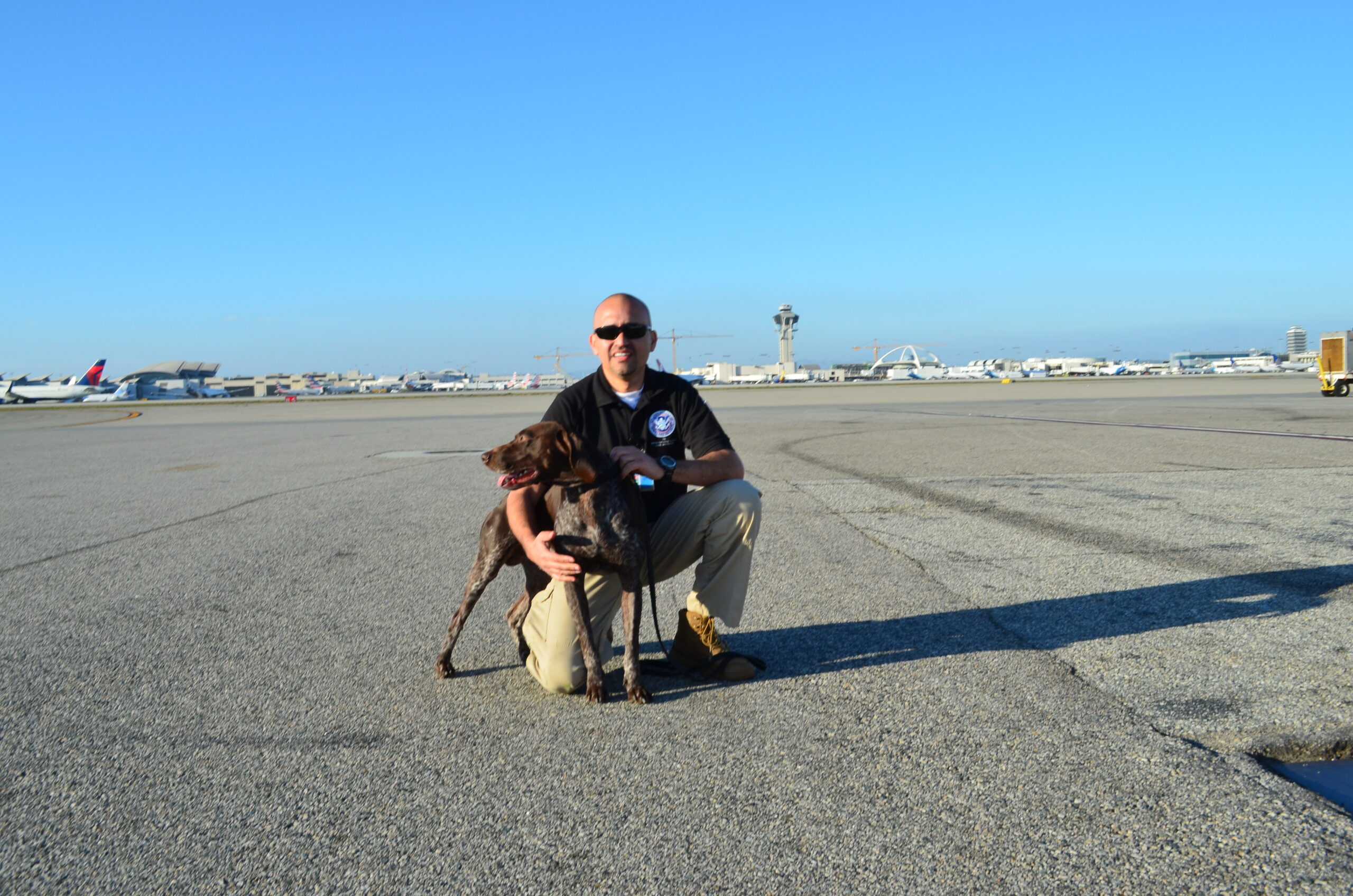 Odey X037 is a Hungarian Vizsla and worked as an explosive detection canine for DHS TSA for 7 1/2 years. Odey worked out of San Francisco, Phoenix, Orlando, and San Diego. Odey had an amazing nose for detecting explosives and won over hearts everywhere he went. Odey retired in May 2022 and has been loving his life with his family at home. Odey loves treats and his favorite reward, the yellow ball on a rope. Odey is truly a “Velcro” Vizsla and follows his handler everywhere.