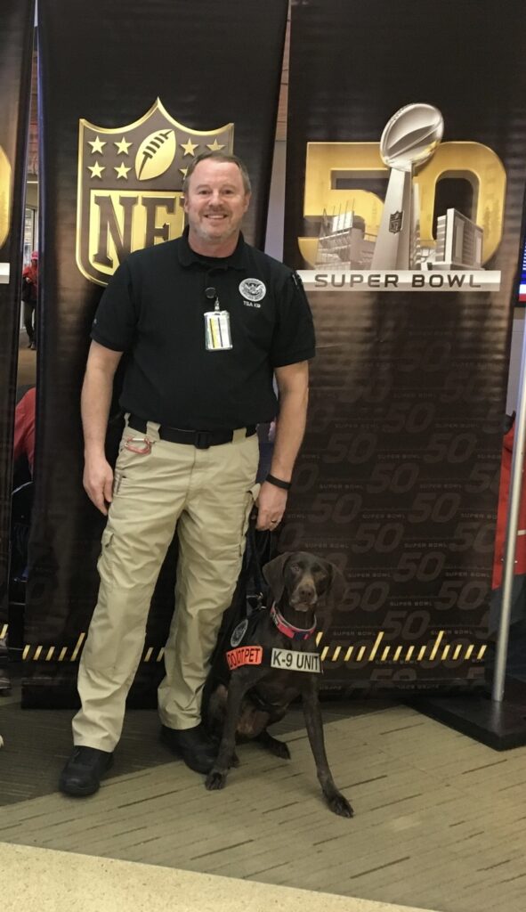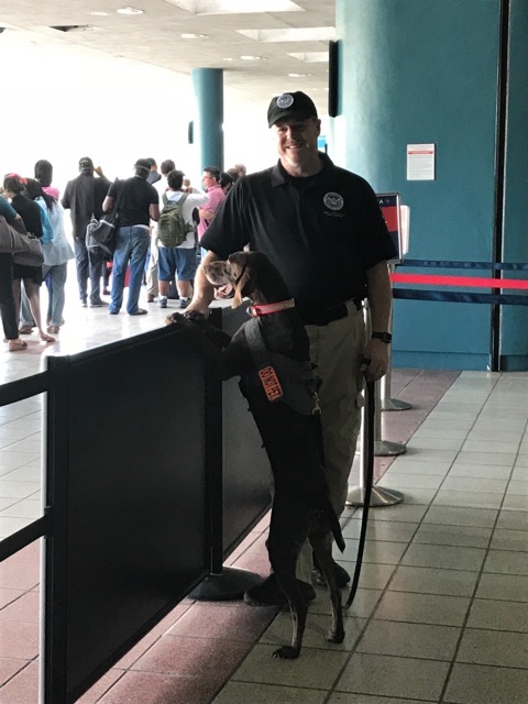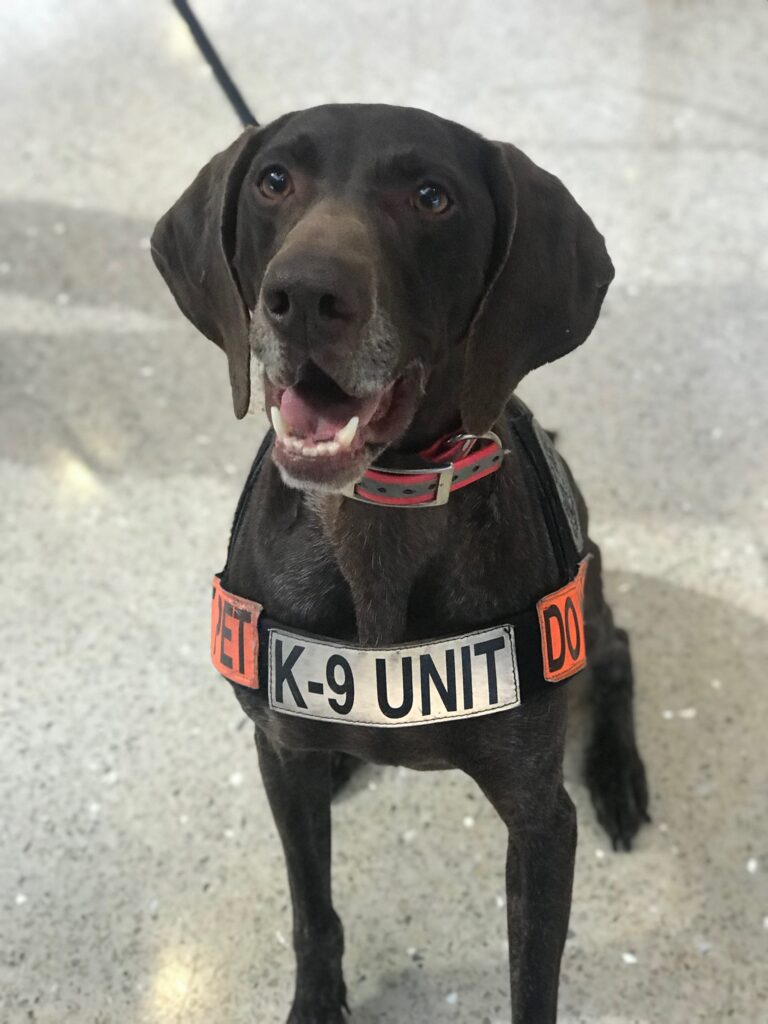 K9 Orka is a faithful partner to TSA K9 Handler Andy Jones. Orka was one of the first passenger screening K9s at LAX and screened thousands of passengers prior to them entering the security checkpoints at LAX, adding a necessary layer to the security there. Orka served from September 2014 until her retirement in September 2019. During her career she also participated in national events, such as the Rose Parade, Super Bowl 50, and deployed to San Juan Puerto Rico following the devastating hurricane in 2017. While on the deployment to San Juan, she subsequently was deployed to the Island of St. Thomas to assist with checked baggage screening after their airport was mostly closed due to the damage from the hurricane. Orka is a high energy, fun, loving dog. She has really enjoyed her retirement with her “brother” K9 Samson who retired when she started her career in 2014. Orka loves the dog beach most of all, and chasing the seagulls when she isn’t jumping into the waves to chase her ball. But mostly, she just enjoys being a dog and hanging out with her nylabone and humans.