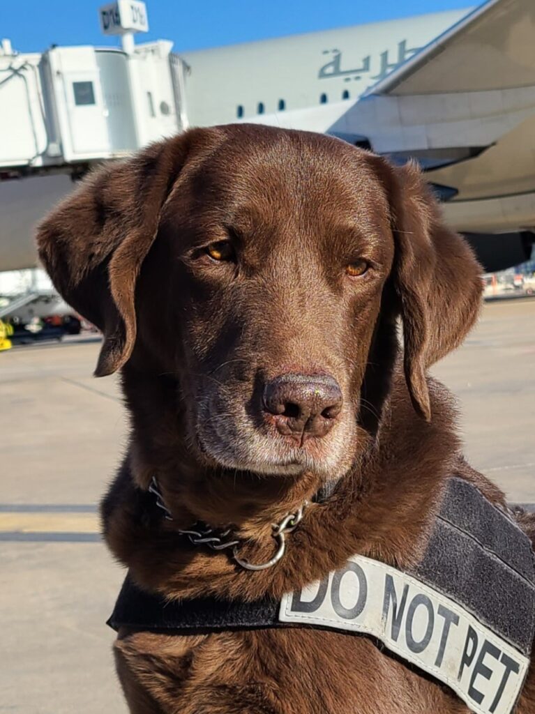 Yunque came from IK9 and recieved training for explosive dection at Lackland AFB. Yunque worked for the Transportation Security Administration from 2017 to 2023. Yunque’s duty station was DFW International Airport. Yunque often assisted with operations at Dallas Love Field. Yunque has had the privilege to work and train with Dallas PD, DFW PD, the ATF and FBI to name a few. Yunque helped with Operations Allies Welcome in Philadelphia. In addition Yuqnue assisted with operations at Minneapolis International Airport, before being medically retired. Yunque enjoys being spoiled by our 3 kids, traveling, swimming and eating as much as a labrador can.